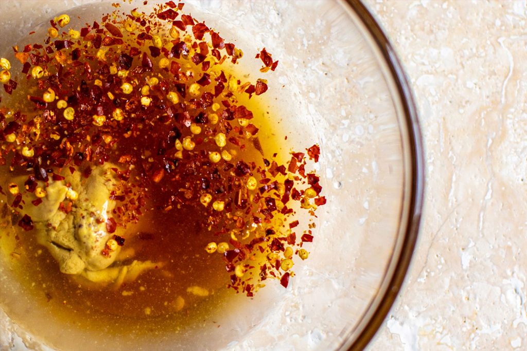 Az évek során ezt a sablont a saját éléskamrámban lévő olajokkal és ecetekkel módosítottam, hogy elkészítsem a vinaigrette-t, amely pácként holdfényt képes tárolni. Először a halmártást apró vízzel hígítottam, hogy hosszabb, szörfözéshez méltó óceáni ízhullámot hozzak létre, amely kiegyensúlyozza a sót. Utána hozzáadom a fehérborecetet (a pezsgőecet is fog működni). Néhány csipet chilei pehely hozza hozzá a hőt, amely bólintást jelent a nuoc cham számára. Miután többféle verziót teszteltem anélkül, úgy döntöttem, hogy egy kis mennyiségű dijoni mustár segít megvastagítani a vinaigrette-et, de egyúttal kissé pézsmas, édes, borsos jegyzetet is ad hozzá, amely szépen kiegészíti a halmártást, és az olívaolaj jön az utolsó simítás.