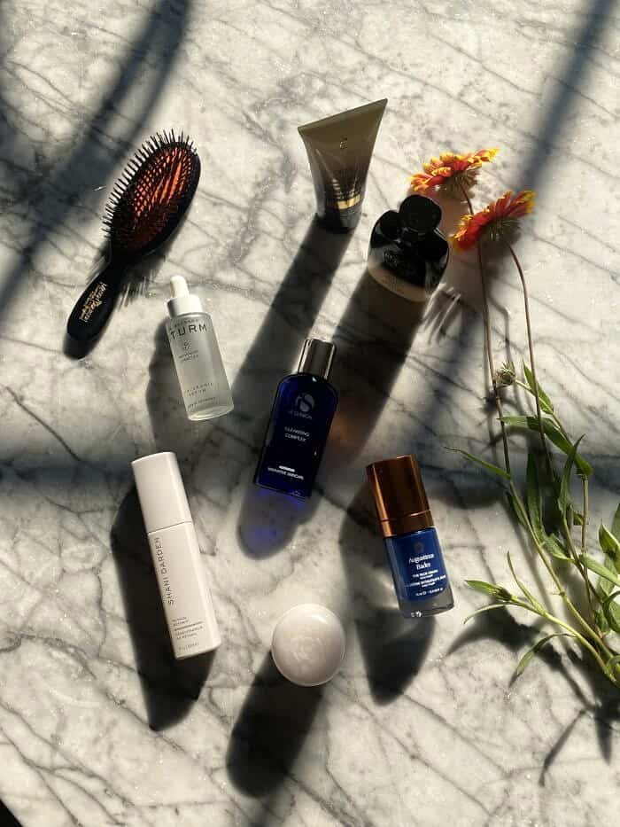(travel skincare – cleansing complex, hyaluronic serum, retinol, rich cream, eye cream, shampoo + conditioner, hair brush)
