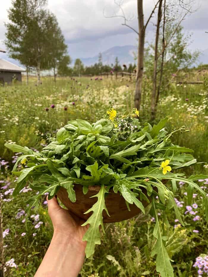 (freshly picked arugula and herbs from the garden)